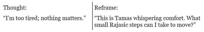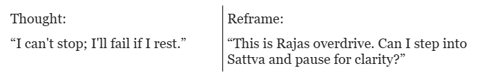 2. Interrupt with Awareness (Sattva) → “Pause, breathe, observe.”