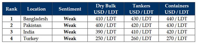 “As the global dark / shadow fleets start to grow, the woeful performance of the Indian sub-continent ship recycling markets continues on, and there are few emerging signs of light at the end of the tunnel (more like an oncoming freight train) for the remainder of this year,” says GMS. “Prices have fallen so low over recent weeks that constant discussions of prices below $400/LDT are comfortably prevalent and it seems increasingly certain that any viable recovery has still not bought a ticket to the sub-continent recycling sector.”